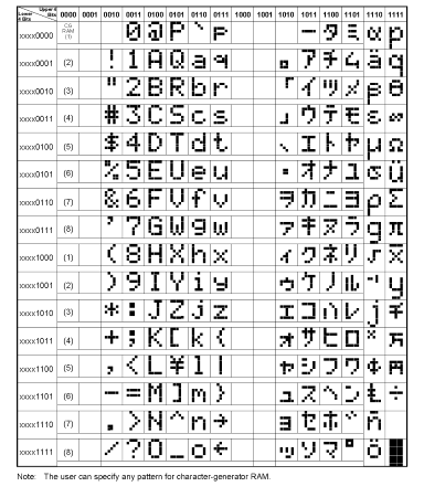 (31) gelten die rechten 2 Spalten in der Tabelle. - Zum Code wird 0xE0 addiert, um die Zeichen 0xE1..0xFF des Displays zu nutzen.